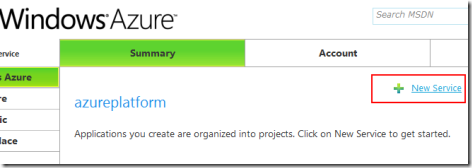 After you log into the Azure Developer Portal, you will need to click on the project row and create a new service.