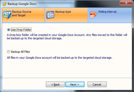 There are two modes of backup, one is a smaller scale by using a specific folder (Drop Folder) inside your Google Docs account. The other one is a bigger scale by backing up everything from the root folder.