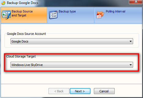 A Backup Wizard will appear, asking you where you want to backup to. Select Windows Live SkyDrive.