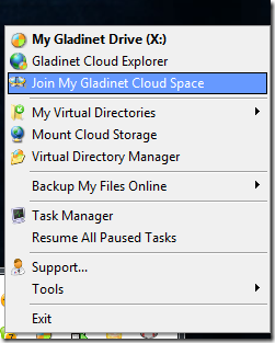 Now from the Systray menu, you can do “Join My Gladinet Cloud Space”. This step will join your instance of Gladinet Cloud Desktop to your Gladinet Cloud Space.