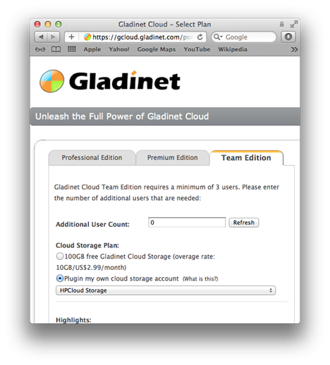 First you need to sign up for the Gladinet Cloud Team Edition, during the sign up, you can select to plugin your own cloud storage account, which is HP Cloud Storage. From Gladinet’s home page, you can select Team Edition. At the following screen, you can select “Plugin my own cloud storage account”, and select “HPCloud Storage” from the drop down list.