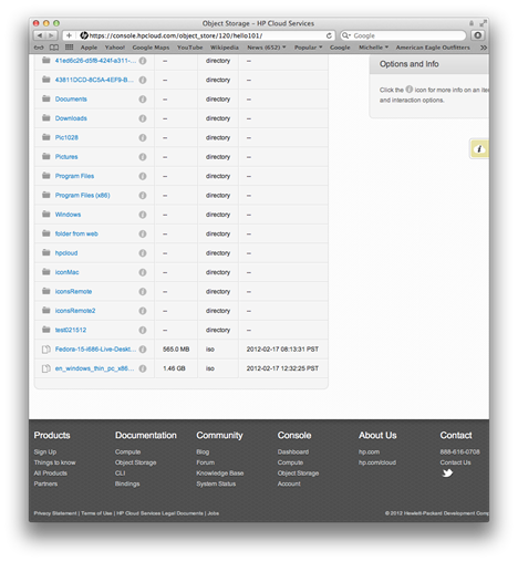 After you sign up, you will see the web browser based file explorer. You will see your HP Cloud Storage account files and folders showing up.